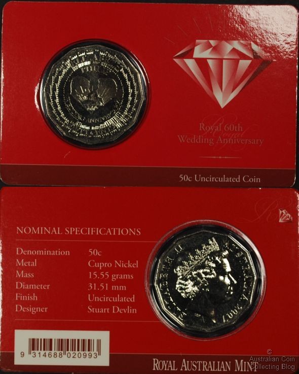 The 2007 60th Royal Wedding Anniversary 50c coin shown above was released by the Royal Australian Mint as a collector coin not intended for general circulation. This is known as NCLT or non-circulating legal tender.