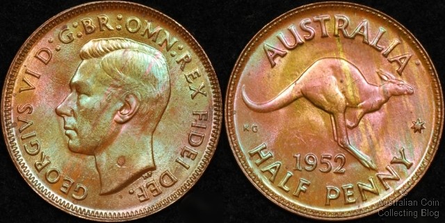 Above you can see a lovely, glossy, lustrous Australian 1952 Half Penny. It's probably the most wildly toned bronze coin we've seen, and completely natural and typical of Perth minted bronze Australian coins. However, the image above doesn't do much to convey just how deep and wild the colours on this coin are. The image below gives a much better idea.