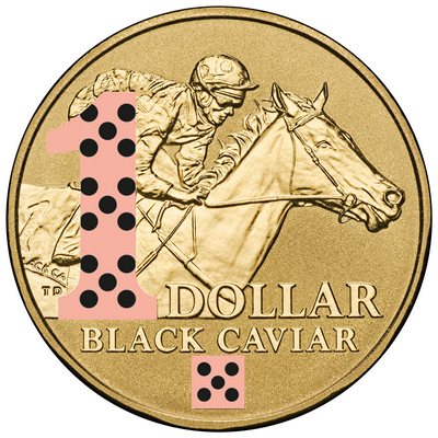 The first Black Caviar $1 coin is shown in the image above. It is a standard size and composition dollar coin, similar to what you'd see in your change. It's made from an aluminium bronze alloy, has a 25 millimetre diameter, and weighs 9 grams. This coin is going to be available with coloured pad printing showing the salmon and black jockey's silks. The coloured Black Caviar coin will be available packed into an information card depicting the horse in question. The same coin will also be available without the pad printing in a Postal Numismatic Cover (PNC). Mintages for this coin are currently unknown. The pad printed 2013 Black Caviar $1 was released at $16.95 and the PNC at $19.95.