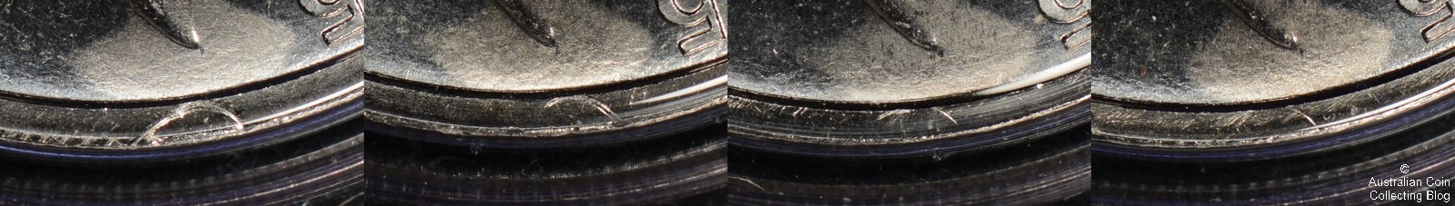 All of the coins showed an unusual lustre break a the bottom of the Queen’s neck on the obverse suggesting the surface texture of the die was different in that area. We’ve spoken to another collector who has some of these coins and his coins exhibit the same characteristic. 8 of the 10 coins had a strike through on the rim near the Queen’s neck. It must have been a small bit of swarf or wire and it’s interesting to see how it moved around from strike to strike. Also, one coin had a oil strike through on the obverse rim around the II of ELIZABETH II.