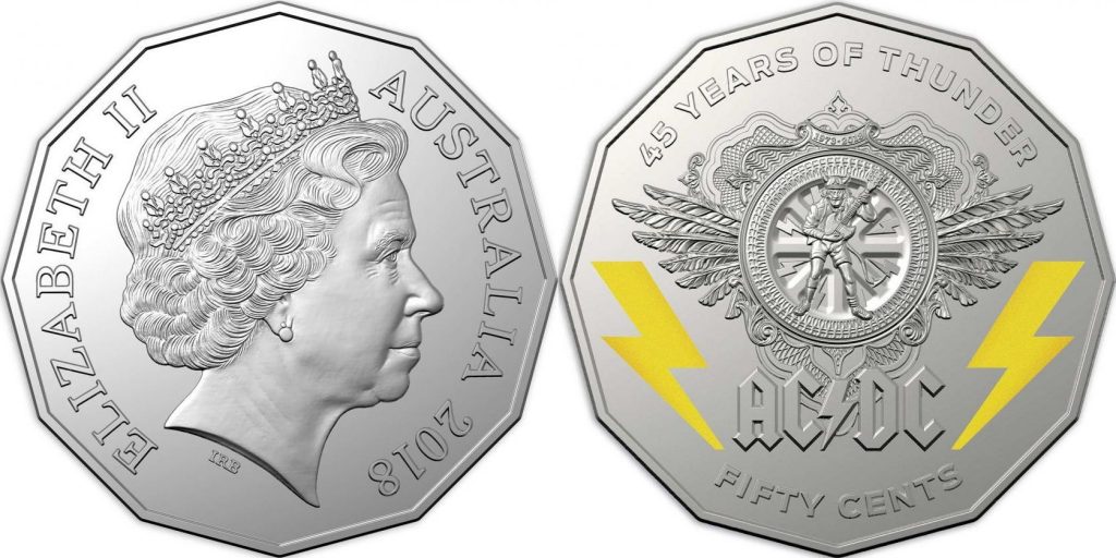 45 Years of Thunder, collector coins commemorating AC/DC have been released with a bang. The phones are ringing hot at coin shops around the country from collectors trying to source these new release Australian coins. The Royal Australian Mint (RAM) has struck two special coins, a coloured uncirculated 50c and a triangular $5 silver plated nickel proof coin.